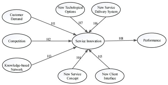 The hypothesis model, i.e., the SEM model, is shown in Figure 2. Customer demand, competition, knowledge-based networks, new service concepts, new client interfaces, new service delivery systems, new technological options, service innovations, and performance are all latent variables.