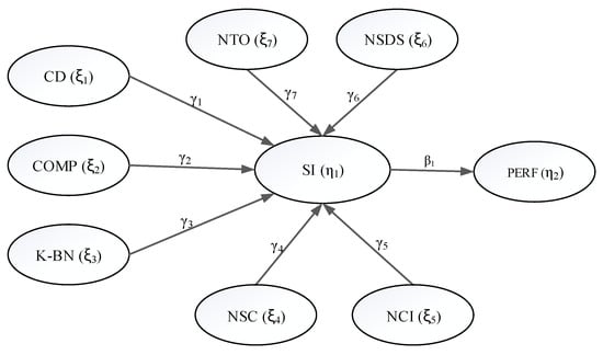 The structural model and the measurement model are parts of The SEM is shown in Figure 3, in which the former reflects the relationship between the manifest variables and the latent variables, while the latter reflects the structural relation between latent variables, which is usually composed of three matrix equations [17,18,19], as follows: