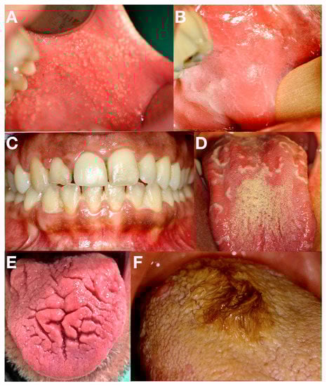 - Dafar, A.; Çevik-Aras, H.; Robledo-Sierra, J.; Mattsson, U.; Jontell, M. Factors Associated with Geographic Tongue and Fissured Tongue. Acta Odontol. Scand. 2016, 74, 210–216. [Google Scholar] [CrossRef] [PubMed]