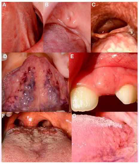 Sublingual varices are clinically evident as small enlarged veins on the anterior ventral surface of the tongue (Figure 2D). They are related to the aging process and hence to collagen elastic fiber degeneration and weakening of the venous wall. In fact, the prevalence of sublingual varices increases with age, reported in up to 60% of elderly patients, in both sexes, and in different population groups. They might be mistaken for Osler–Weber–Rendu syndrome or hereditary hemorrhagic telangiectasia or multiple hemangiomas. Hypertension, cardiovascular diseases, smoking, and dental wearing are described as associated with sublingual varices [30].