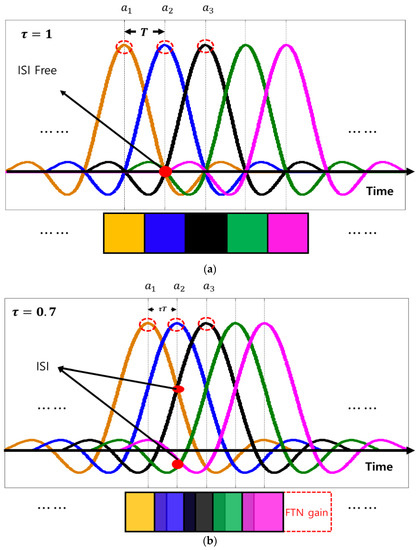 in type 2, where the range of the FTN interference ratio between groups was set to low in the UEP-FTN algorithm. In addition, it was shown that the performance improved by 0.2 dB and 0.3 dB in the case of an average interference ratio of 30% and 40%, respectively, in type 4, where the range of the FTN interference ratios between groups was set to high. The simulation demonstrated that the most excellent performance was obtained in type 4, where the range of the interference ratios for each group was set to high through each priority algorithm, and the low interference ratio was applied to the high-priority group.