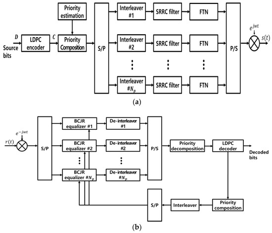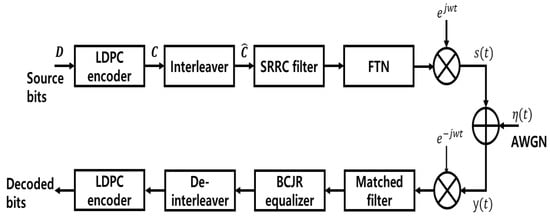 Transmit signals that pass through the additive white Gaussian noise (AWGN) channels go through a demodulation process. Moreover, an amount of FTN interference is removed through the BCJR equalizer. After de-interleaving, reordered signals arranged by the UEP algorithm are inputted into the LDPC decoder. The iterative turbo equalizer consists of inner codes and outer codes, and we the BCJR is employed as an outer code and the LDPC code as an inner code. At the receiver side, powerful turbo equalization algorithms that iteratively exchange probabilistic information between the inner decoder and outer decoder are used, thereby reducing the error rates significantly. The inner coded bits are then subtracted from the input and interleaved. The interleaved output is canceled a posteriori from the proceeding received signal. Thus, the algorithm enhances the performance, while maintaining or improving the transmission efficiency of the existing FTN transmission method.