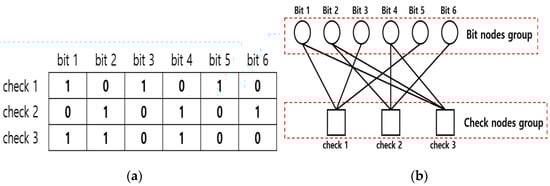16], is used to accelerate the LDPC decoding speed, because it needs fewer iterations to maintain the same performance. However, in this study, it was used to configure the priority algorithm. In deciding which group has the higher priority, the HSS-based LDPC decoding algorithm, which is explained above, was applied. Unlike conventional LDPC decoding processing, which calculates bit nodes’ and check nodes’ updating sequentially based only on messages updated in the previous iteration, in the HSS-based LDPC decoding process, the already updated bit node and check node in the same iteration move to a different bit and check node. Therefore, the bit node groups linked to the check nodes, which are arranged on the left, are assigned a higher priority. For example, as shown in