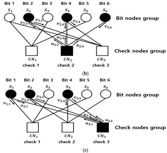coming out of the check node is updated using Equations (9)–(11). Then, all