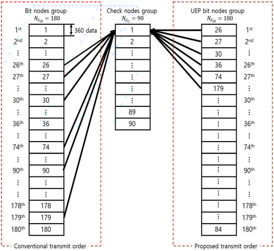 For instance, with no UEP setting, signals are transmitted in the order from the 1st bit node group to the 180th bit node group. If the priority algorithm configures and sends the UEP setting, the 26th bit node group, connected to the 1st check node group, is transmitted instead of the 1st bit node group, as shown in the right part of