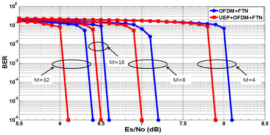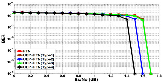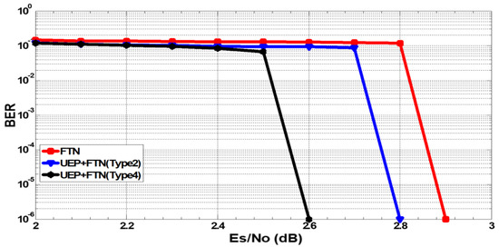 Figure 10, the red BER curves represent the performance, with the interference ratio set at 30% and 40% in the FTN, without UEP. Compared to FTN without UEP at the BER of