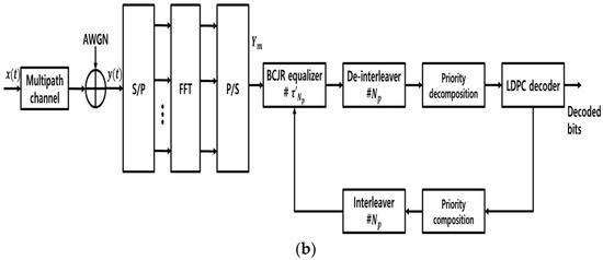These results can be interpreted as follows. First, the reason why the range of the interference ratios was set to high was because the difference in the branch metric allocated to each trellis became larger, allowing the BCJR decoder to operate efficiently. Second, applying the low interference ratios was applied to the high-priority signal in order to enhance the reliability of the transmitted signal, the LDPC decoder can update the highly reliable data by the calculation of the bit node and check node updating. Through this process, the performance can eventually be improved.