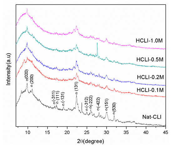 Nat-CLI, HCLI-0.1 M, HCL-0.2 M, HCLI-0.5 M, and HCLI-1.0 M are mainly composed of clinoptilolite; however, their crystallinity decreases with acid treatment.