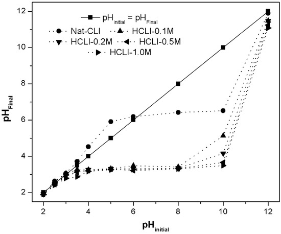 As shown in Figure 4, the pHPZC values before and after the acid-modified clinoptilolite-rich tuffs were 6.00 ± 0.01, and 3.00 ± 0.01, respectively. The decrease in pHPZC is the result of the chemical modification of Nat-CLI by the acid treatment. Therefore, the acid-modified clinoptilolite-rich tuffs present a large pH range where the surface charge of the materials is negative (3–12), as compared to Nat-CLI (6–12). On the other hand, the chemical treatment promoted a decrease in the negative charge, and consequently, a decrease in the number of cations and the generation of very strong Lewis acid sites on the surface of the H-CLI samples. In this sense, Rožić et al. [39] reported that the following reaction took place >Al-OH + H+ → >AlOH2+ after the contact of the clinoptilolite-rich tuff with strong acid solutions.