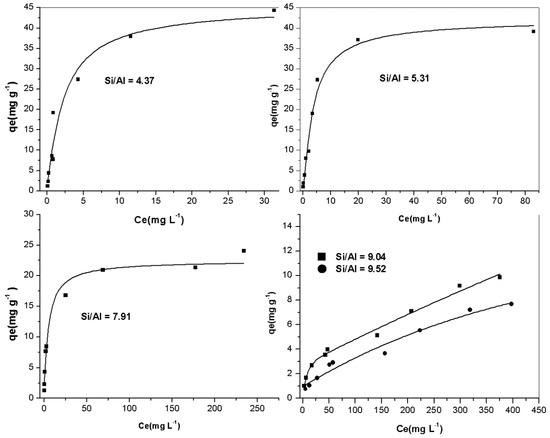 Isotherm suggests that the Pb(II) sorption process for Nat-CLI, HCLI-0.1 M, and HCL-0.2 M are well described by the Langmuir model. The maximum sorption capacity of samples with Si/Al ratios of 4.37, 5.31, and 7.91 are 48.54, 37.04, and 14.99 mg g−1, respectively. The experimental data fit better to the Freundlich model for the sorbents with Si/Al ratio of 9.05 and 9.53.