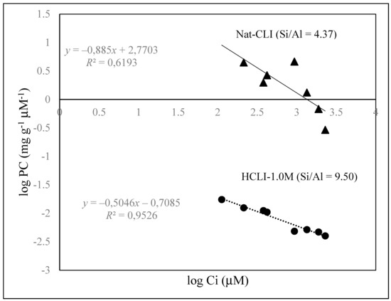 Comparison between the log PC for Nat-CLI and HCLI-1.0M as a function of log Ci of Pb(II) in solution.