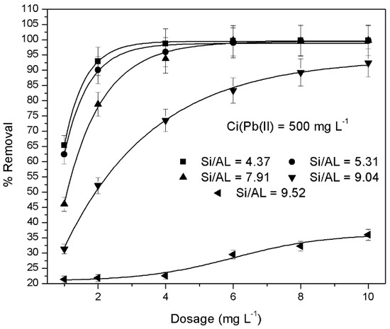The percentage of Pb(II) uptake with respect to the non- and acid-modified clinoptilolite-rich tuffs dosages (mg L−1) is shown in Figure 9. It can observed that the dosage of all of the sorbents used is a very important parameter for Pb(II) uptake. The increment in sorption capacity was attributed to a higher number of available sorption sites [12]. In the case of sorbents with Si/Al ratios of 4.37, 5.31, and 7.91, sorption efficiency was highly dependent on increase in the sorbents dosage of solution up to 6 mg L−1 when the maximum Pb(II) uptake percentage (99.99%) was achieved. For sorbents with a Si/Al ratio of 9.05 and 9.52, Pb(II) removal increases gradually with dosage, reaching 92.36% and 35.99%, respectively. One explanation of this behavior is the few available sorption sites in the zeolite networks of HCLI-0.5 M and HCLI-1.0 M to be occupied by the Pb(II) chemical species. The H-CLI1.0 M has the lowest amount of Al in the zeolitic material diminishing the ion exchange capacity. The amount of Ca2+ in the zeolitic material also drastically diminished, limiting the ion exchenge: Pb2+(s) + Ca2+(z) → Pb2+(z) + Ca2+(s), where s represents the solution and z the zeolitic material. The sites where the K+ are located into the zeolite network [47] do not favor the ion exchange with Pb2+. Another explanation of this behavior is by the change of the nature of the zeolitic material from hydrophilic to hydrophobic character [36].