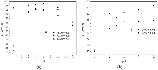 For the second group (Figure 10b), which corresponds to sorbents with a Si/Al ratio of 9.05 and 9.52, solution pH has a significant influence on the Pb(II) uptake percentage. In the pH range of 2–6, the removal percentage of Pb(II) increases progressively from 22.22% to 82.02% and from 19.48% to 67.48% for Si/Al ratio of 9.05 and 9.53, respectively. At higher pH values, Pb(II) sorption increased continuously up to 93% and 70% for HCLI-0.5 M and HCLI-1.0 M, respectively. This can be attributed to the high acidity of these materials which has a beneficial effect, disfavoring the hydrolysis of the metal ions in the solution [12].
