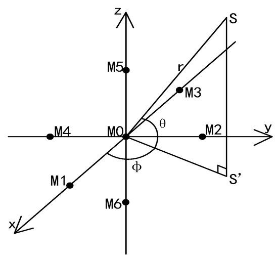 For the X0Y plane, M1, M2, M3, M4 and M0 form the first single-plane five-element microphone array, setting the rectangular coordinate parameters of the sound source as , and the spherical coordinates as . According to the principle of sound source geometric localization, using the distance formula between S and M0, M1, M2, M3, and M4, is derived: