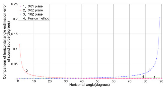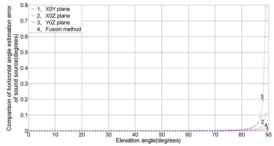 As shown in Figure 2, the elevation angle estimation error is greatly influenced by itself, where the error measured in the X0Y plane decreases with increasing elevation angle , and the error measured in the X0Z and Y0Z planes increases with increasing elevation angle . Through the three-plane fusion algorithm, the error is weakly influenced by itself, with an error of less than 0.001°. In conclusion, the fusion algorithm has advantages over a single-plane microphone array in elevation angle measurement precision, and its stability is obviously better than that of the X0Y, X0Z, and Y0Z plane approach.