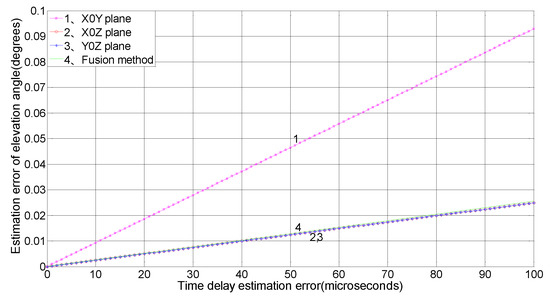 Figure 5 shows that as the time-delay estimation error increases, the elevation angle estimation error measured in the X0Y plane shows the greatest increase. The X0Z and Y0Z measurement errors increase minimally, and the error of three-plane array is close to that of the X0Z and Y0Z planes, with a small increase. When the time-delay estimation error is 100 μs, the error is only 0.025°.