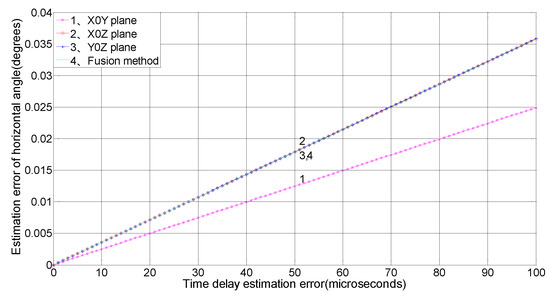The relationship between the time-delay estimation error and the horizontal angle measurement precision is shown in Figure 6 for a horizontal angle of 45° and an elevation angle of 15°.
