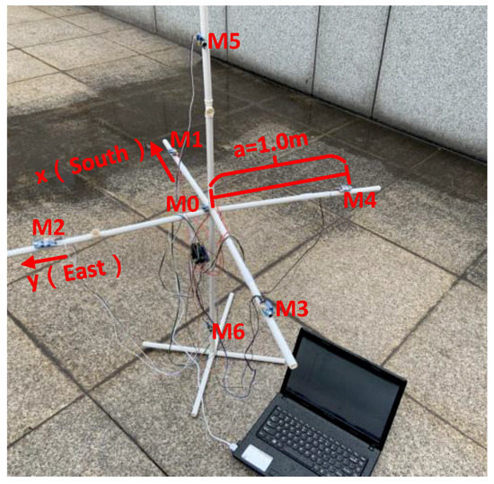 The outdoor experiment was carried out on the upper floor aisle of School of Electronic and Information Engineering, Nanjing University of Information Science and Technology. On this occasion, the target of sound source localization was thunder source point. The outdoor experiment scene is shown in Figure 8.