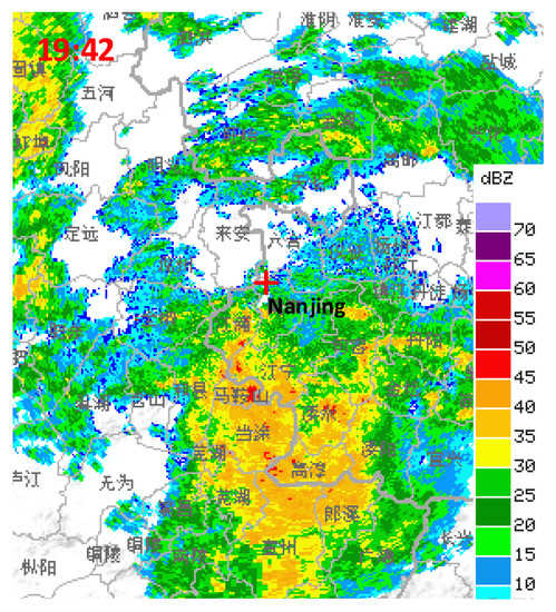 In Figure 8, the positive half of the x-axis and the y-axis of the three-plane five-element microphone array were respectively aligned in the south and east directions. With the help of the real-time data from the radar chart, the outdoor application effect of the fusion algorithm was analyzed. We set the array element spacing to 1.0 m and conducted two experiments to expect the algorithm to provide data feedback for thunderstorm cloud forecast warnings. The first experimental time was around 19:42 on 22 April 2019, and the data obtained by the fusion algorithm and the radar chart at this time are shown in Table 7 and Figure 9, respectively. The second experimental time was around 20:10 on the same day. Table 8 showed the measured results of the fusion algorithm, and Figure 10 was the real-time radar chart. In addition, the red cross marked in Figure 9 and Figure 10 was the position of the measurement point.