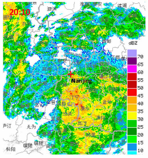 In Table 8, the thunder source point coordinates measured by the fusion algorithm were (1.4 km, 78.5°, 46.9°). The thunder source was about 46.9° south by east, and it was only 1.4 km away from the array. In particular, the elevation angle was 78.5°, which was almost perpendicular to the z-axis. At this time, it is considered that the thunder source had occurred in the upper area of the array. At this point, in Figure 10, the radar echo intensity exceeded 40 dBZ, indicating that a large amount of charge was accumulated in the cloud layer above the array, and there was indeed a thunderstorm cloud. In summary, at 20:10 on 22 April 2019, the thunder source was generated over the test point, and the measurement results of the radar chart were consistent with the results obtained by the fusion algorithm. This is a good illustration of the effectiveness of the algorithm, and this experiment also verified the prediction of the previous experiment.