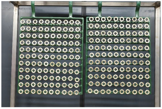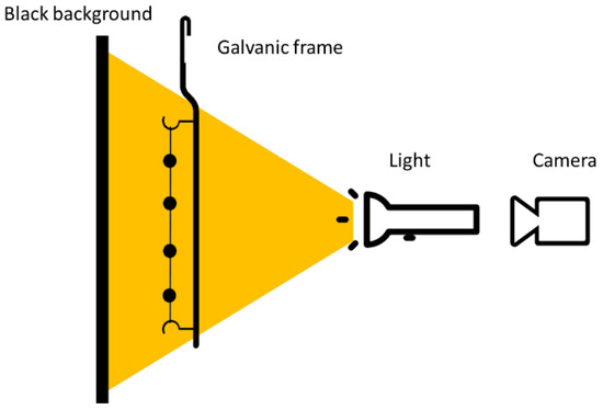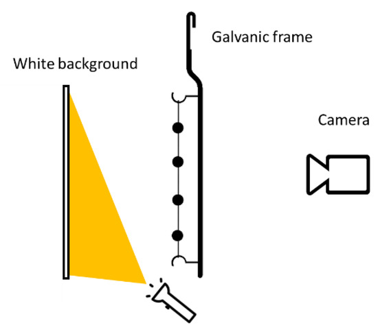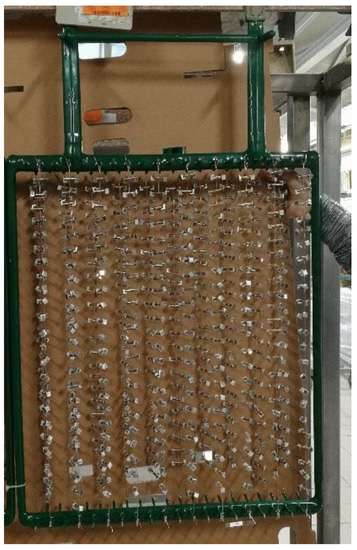 In industrial practice, a single galvanic frame is filled with a number of identical items. In order to make the performed tests representative and speed-up the testing process, we chose to use typical galvanic frames filled with a variety of items of different shapes and dimensions arranged on vertical metal wires, instead of using multiple frames (each one with a single item typology). Image acquisition was carried out by using a Fujifilm T1 SLR camera (APS-C sensor format, Fujifilm Holdings Corporation, Tokio, Japan) and an 18 mm focal length lens. The acquired images had a resolution of 15.8 megapixels (4826 × 3264 pixels).