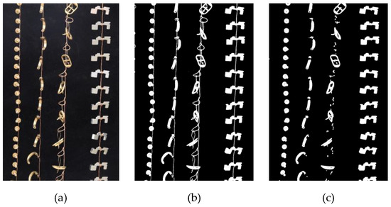 However, this solution may also lead to some unwanted side effects that make this alternative unsuitable. In fact, in Figure 7b, it can be noted that, in some cases, the wires formed closed loops in the image. Such loops may result in being completely closed by a morphological closing filtering. If sufficiently large, they can be easily mistaken for items in the counting phase. In addition, if a couple of items are sufficiently close, the filter may cause the fusion of the relative clusters into one (see Figure 7c).