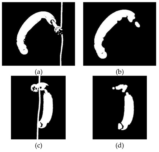 In more detail, sub-fragmentation can occur in two possible scenarios: In the presence of bridges (Figure 6a) or in the case of inner holes (Figure 6c). In the first case, the thickness of the bridge may be similar to the thickness of the wires to be removed. Consequently, a common occurrence was that the morphological opening on the binary image (i.e., the erosion followed by dilation) removed both the wires and bridges, thus causing undesired fragmentation of the cluster (Figure 6d). Similarly, in the case of the inner holes—given by the actual shape of the item or caused by thresholding—morphological opening may cause fragmentation.