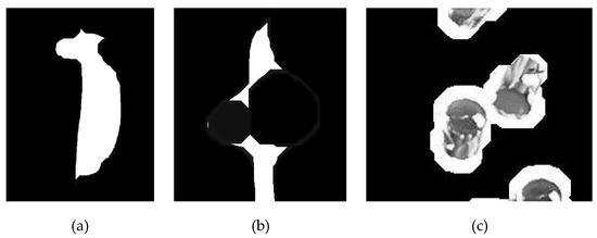 (a) Item B after morphological image closing plus image erosion; (b) an example of wires loop after morphological closing followed by image erosion; (c) clusters merged after dilation. The image is intentionally left in grayscale to show actual original items.