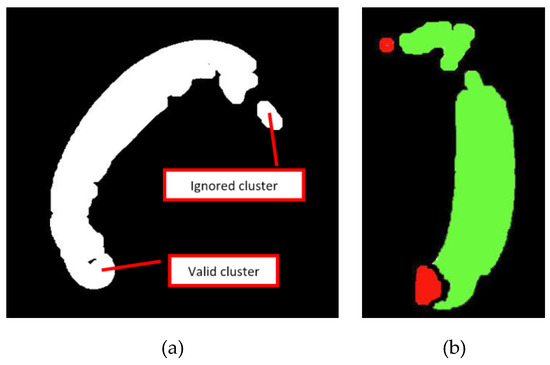 Since the item dimensions are widely variable and unknown a priori, a fixed area threshold value cannot be based on the item dimension itself. On the contrary, the wire dimension is constant. Accordingly, it is possible to define a fixed area threshold under which clusters are considered too small to be an item, thus must be ignored. Considering that the wire thickness is approximately 1 mm—corresponding to 7 pixels in the image (based on the shooting setup described in the previous section), a limit dimension was set at 4 mm2—corresponding to 200 pixels. In the example shown in Figure 8a, this method allowed appropriate discarding of small clusters.