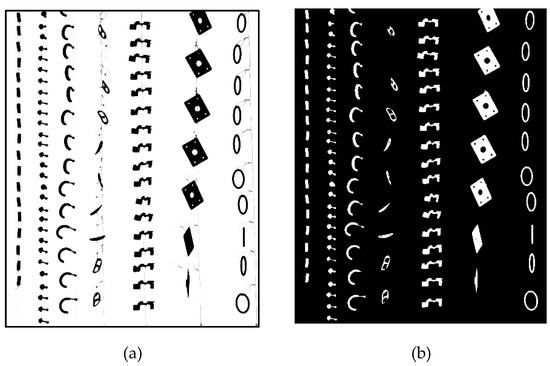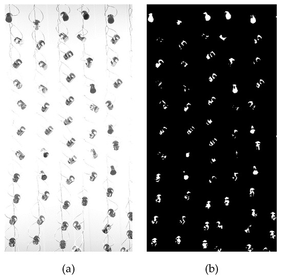 (a) Original image acquired with backlighting; (b) image of Figure 10a after thresholding showing that some items portions are mistakenly assigned to the background.