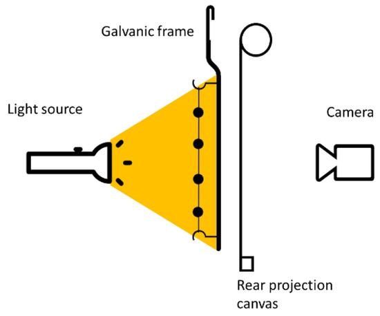 Moving from the issues faced with the first setting, the second layout makes use of backlighting. The galvanic frame, containing a set of identical items, is arranged between the camera and an approximately uniformly illuminated white background (see Figure 9).