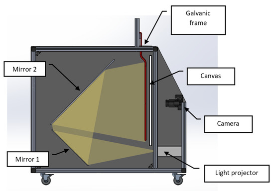 To overcome all the discussed drawbacks related to direct backlighting, a third solution was developed and tested. In detail, a 0.5 mm thickness white canvas for rear-projection (100% polyvinyl chloride - PVC) was placed at a 20 mm distance from the galvanic frame, containing seven item typologies while the light source (in this case, an overhead projector with a 3300 lumen light source) and camera were arranged as depicted in Figure 11. This architecture allowed acquiring, from the scene, the projected item shadows rather than the items themselves. This enabled discarding of any kind of reflection. The light source came from an LCD overhead projector with 1000 lumens.
