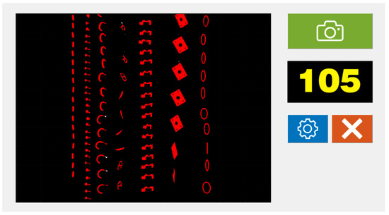 Dedicated GUI implemented for controlling the counting machine performance. On the left, it is possible to read the number of items. Moreover, it is possible to save the screened image (green camera icon) and to close the application (red X in figure). The user can also access a setting panel (blue gear icon) in case they want to set a different threshold value for the algorithm.