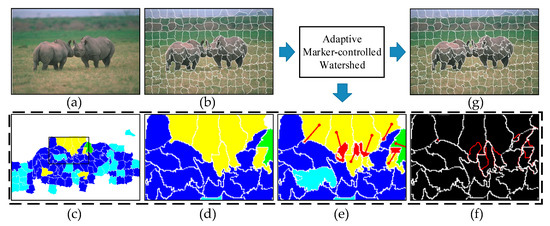 In the next step, the adaptive marker-controlled watershed approach is adopted to subdivide the under-segmentation superpixels (green and yellow regions in Figure 2e). In the first case, a set of markers for topographic surface flooding is defined as by (4)–(6). Another situation is , where is the cluster center of and represent(s) the entire partition of isolated region(s) with relative large color difference by (7) and (8):