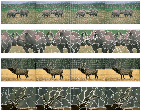 Figure 3 provides four results for visual comparison of superpixels obtained by the above-mentioned algorithms. As is intuitively depicted, SLIC, sSLIC and LSC all present relative compact and uniform superpixel apart from watershed. Nevertheless, in order to maintain compactness, SLIC fails in some detail-rich regions such as ear of the rhinoceros and antler of the wapiti. Moreover, the biggest advantage of SLIC is the high efficiency, which may sacrifice some performance, for instance, the content awareness. Therefore, in some regions with weak boundaries, e.g., the head of the leopard, it is difficult for SLIC to attach the actual borders since it merely relies on clustering of local color-spatial features [30].