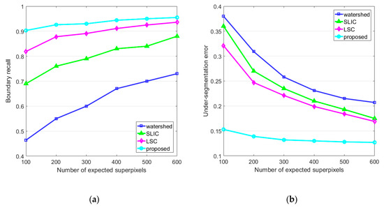 Quantitative evaluation of different algorithms in terms of boundary adherence. (a) Boundary recall; (b) Under-segmentation error.