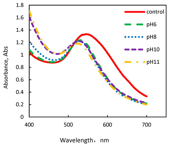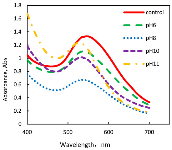 In this study, we aimed to investigate the pH effect on the production of AuNPs when pHs (from 6 to 11) adjusted before the reaction started. We were particularly interested in investigating the appearance characteristics (such as shape, size, etc.) and distribution of the formed AuNPs. The AuNPs which synthesized at different pHs were analyzed using an UV-vis spectrophotometer. The absorbance curves of the AuNPs obtained are shown in Figure 1. The maximum absorption wavelength (λmax = 545 nm) in Figure 1 is found in the control group (pH = 3), and shifts from 536 nm to 529 nm (blue shift) along with the solution pH increases from 3 to 11. It means that increasing the pH of a solution decreases the AuNPs size. Additionally, inverse correlation between the absorbance intensity of AuNPs and the solution pH occurs. The absorbance intensity of all the AuNPs groups decreases, accompanied by the increase in pH (pH = 6, 8 and 11). Compared to the absorbance intensity of 1.33 at λmax = 545 nm (control), only 0.67 is observed at λmax = 536 when pH is 8.