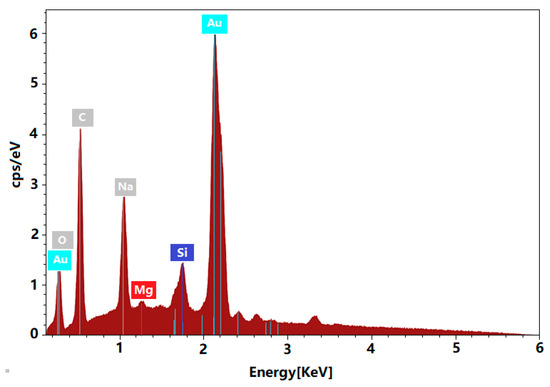 Energy-dispersive spectroscopy (EDS) analysis was performed to detect the elements contained in AuNPs solution when pH = 11. As shown in Figure 2, a strong signal is observed around 2.2 keV, which conforms the existence of Au in the solution where the redox reaction happened between Au3+ and the fruit peel extract. Meanwhile, C, O, and Na elements are observed on the fabricated AuNPs EDS spectra. These elements exist in the cellulose and salinity in C. sinensis peel extract. NaOH solution is the other source of Na atoms.
