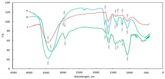 FTIR was carried out to determine the major functional groups that are responsible for the reduction of Au3+ in solution. Besides, the possible mechanism in the synthesis and stabilization of the ultra-small sized AuNPs that were obtained by adding OH− into peel extract in different sequences is discussed. Figure 7 illustrates the FI-TR spectra obtained from control group (curve a: Au3+ and C. sinensis peel extract mixed solution, nothing reacting with Au3+), the pH adjusted to 11 before synthesis reaction (curve b) and pH adjusted to 11 after AuNPs synthesis reaction (curve c).