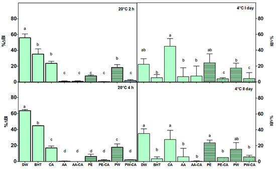 After 2 h of storage time (Figure 2), the browning appearance was evident in control dipping (DW) which showed the highest ΔBI, while adding the preservative agents, the tissue browning was significantly reduced (p < 0.05). The potato extracts, both water (PW) and ethanol (PE) solutions, showed an anti-browning effect comparable to the standard compounds. The beneficial effect exerted by P extracts could be linked to their phenolic content. Phenols have shown different behavior in enzymatic browning, depending on the type of compounds involved [49]. In the case of potato peels, the phenolic fraction contains substances, such as chlorogenic acid and caffeic acid [34], able to inhibit the PPO activity [28].