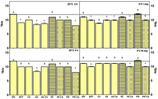 During the storage at 20 °C (after 2 and 4 h) the water control (DW) maintained the initial TSS values while a reduction was observed in all the other treatments (Figure 3).