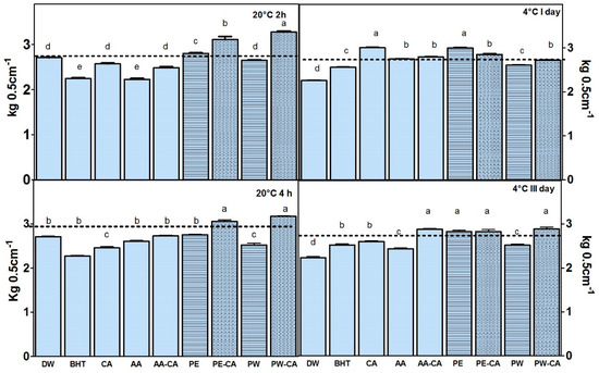 Under cold temperature at 4 °C (Figure 4), in DW dipping treatment a texture decrease was observed with a tissue strength decline of about 17% after 1 day of storage. All the other agents, particularly PE and PE-CA, showed effectiveness in maintaining the cut surface firmness until 3 days of storage.