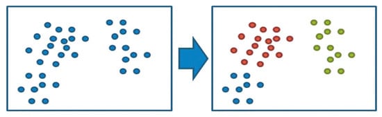 In addition to the PCA method, another method, the K-means method [], is also employed in this study. In the field of data mining, the K-means method has been, and still is, a widely accepted and popular method for data-clustering, even in recent years [,,,]. It is a ‘classifier’ that is frequently applied by analysts in order to classify the data points in question into several ‘clusters’. A point in a cluster is said to be identical or similar to other points in the same cluster when their similarity can be justified based on some properties (i.e., ‘attributes’, ‘factors’, or even ‘features’; the usual term is subject to the field or domain), but points in the same cluster are all quite different from the points in any other cluster. Figure 2 illustrates such a clustering process, and such a process can be performed by using the K-means method.