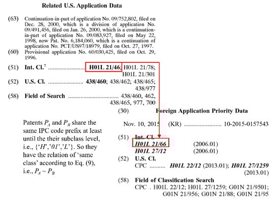 The following example illustrates the above ‘same class’ relation between two patents, and the positive consequence of identifying this relation (i.e., altering the data granularity greatly simplifies the process of patent data preprocessing). As shown in Figure 4, the former patent, A, receives several IPC codes, but all of them are prefixed with ‘H01L’ until the third subclass level. Although patent B receives only one IPC code, which is ‘H01L 21/302’, the IPC codes of A and B share a ‘H01L 21’ prefix, although the last code of A, ‘44’, does not match with the last code of B, which is ‘302’. The fact that their IPC codes are identical until the fourth group level implies that they have the aforementioned ‘same-class relation’ (i.e., ), regardless of whether the tail parts (the overlapped ‘21/*’ group/subgroup codes) are identical or not.