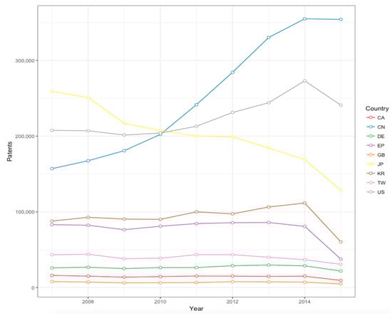 The trends in patenting throughout the technology industry worldwide is the first focus of analysis. A descriptive analysis accumulating the annual number of patent applications in the 9 countries during the 2007–2015 period is made. In terms of the total amount of patents applied for (in Sections G and H) year by year, Figure 5 shows the general trends in patenting in the technology industry in each country. According to the rule that “the greater the number of applications received by a country’s patent office is, the larger the size of the market in this country will be”, it is observed that the biggest markets worldwide during these years were the USA, JPN and CHN.