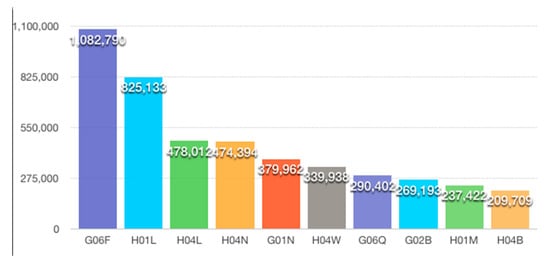 In the data repository, the patents that have the same 3-tuple values in Sections G and H (i.e., {section, class, subclass} values, as mentioned in Section 3.1) are counted for each country. This is followed by a process in which each 3-tuple is accumulated over all the countries. This results in a table which carries the information of “the total number of times patents have received a given IPC code prefix in the top 9 technological powers during the period”. By sorting this table, the top 10 ‘hottest technologies’ can be observed along with the top 10 IPC codes. These are visualised in a histogram in Figure 6.