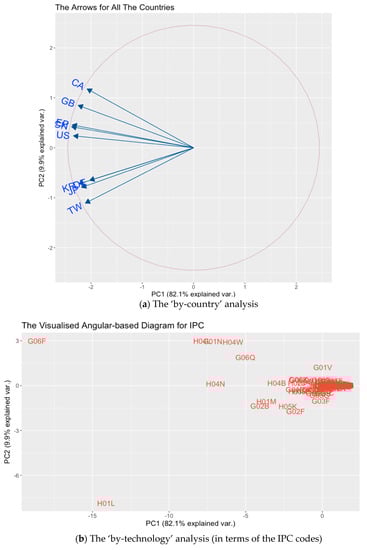 For simplicity in the presentation, in this study, each of the points, the locations of which show the features of a technological area, are separately plotted in Figure 7b, while the arrows that connote the patenting activities of the countries are plotted in Figure 7a. In both figures, the coordinate system is weaved by the first principal component (as the x-axis) and the second principal component (as the y-axis), but the meaning of an arrow and that of a point are different. Each point in Figure 7b, (), is for (the feature of) an IPC code, in terms of its weight in the equation for and the weight in that for . Each arrow in Figure 7a, () is for (the feature of) a country, in terms of its weight in the equation for and the weight in that for . This benefits the upcoming discussions.