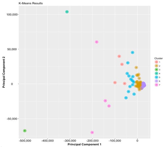 In our analysis, not only is the ‘best clustering scenario’ for the source data points (of the IPC codes, as shown in Figure 7b) identified; rather, the suitable value for k, which is the optimal number that is to be set for the number of clusters, is also obtained. The results of this clustering process are also visualised in Figure 8, with the most appropriate k value set at k = 7, because the minimal value of the objective function in Equation (5) is obtained (that is, the model reaches optimality) when k = 7.