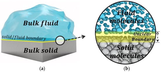 The recent advances of nanotechnology have motivated the need for understanding molecular-level physics of nano-devices such as energy storage [], water purification [,], electric power generators [,], biochips [], and integrated fuel cells. For those nano-devices, the scale of modeling is comparable to the size of electron orbitals, and therefore, the solid/fluid boundary is ambiguous (see Figure 1). Currently, the solid/fluid boundaries have been defined within one atomic diameter discrepancy. Depending on where the boundary defined, the size of the channel or nanoparticle [], slip length [], Kapitza length [], dynamic properties [], and even material properties can be differently estimated. Furthermore, defining solid/fluid boundary is related to the location of the boundary condition (i.e., hydrodynamic slip and interfacial thermal resistance) of continuum modeling [,,,]. These errors may have a minor influence on large systems (~larger than 100 nm) but have a significant effect on the sub-10 nm system. As semiconductor production processes recently reduced to the single digit nanometer sizes [] and novel nanochannel fabrication techniques have been developed [,], a proper definition of the solid/fluid boundary becomes increasingly important. However, there has been little attention on the atomic-level definition of solid/fluid boundary.