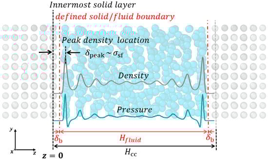 Figure 3 shows a typical density and pressure distribution near the metallic surface []. The fluid molecules form a dynamic structure near the surface called density layering. This non-homogeneous distribution of fluid atoms results in a high local pressure variation near the surface []. Several terminologies are defined in order to closely investigate the solid/fluid interface. The center-to-center height () is defined as the distance between the innermost solid layers. The innermost solid layer is defined as the most probable location of innermost solid atoms. The parameter is the distance between the innermost solid layer and the defined solid/fluid boundary as shown in Figure 3. As the definition of solid/fluid boundary is assumed as a plane in this work, a new definition of solid/fluid boundary can be easily applied to the continuum analysis []. Then, the effective channel height is a function of ; .